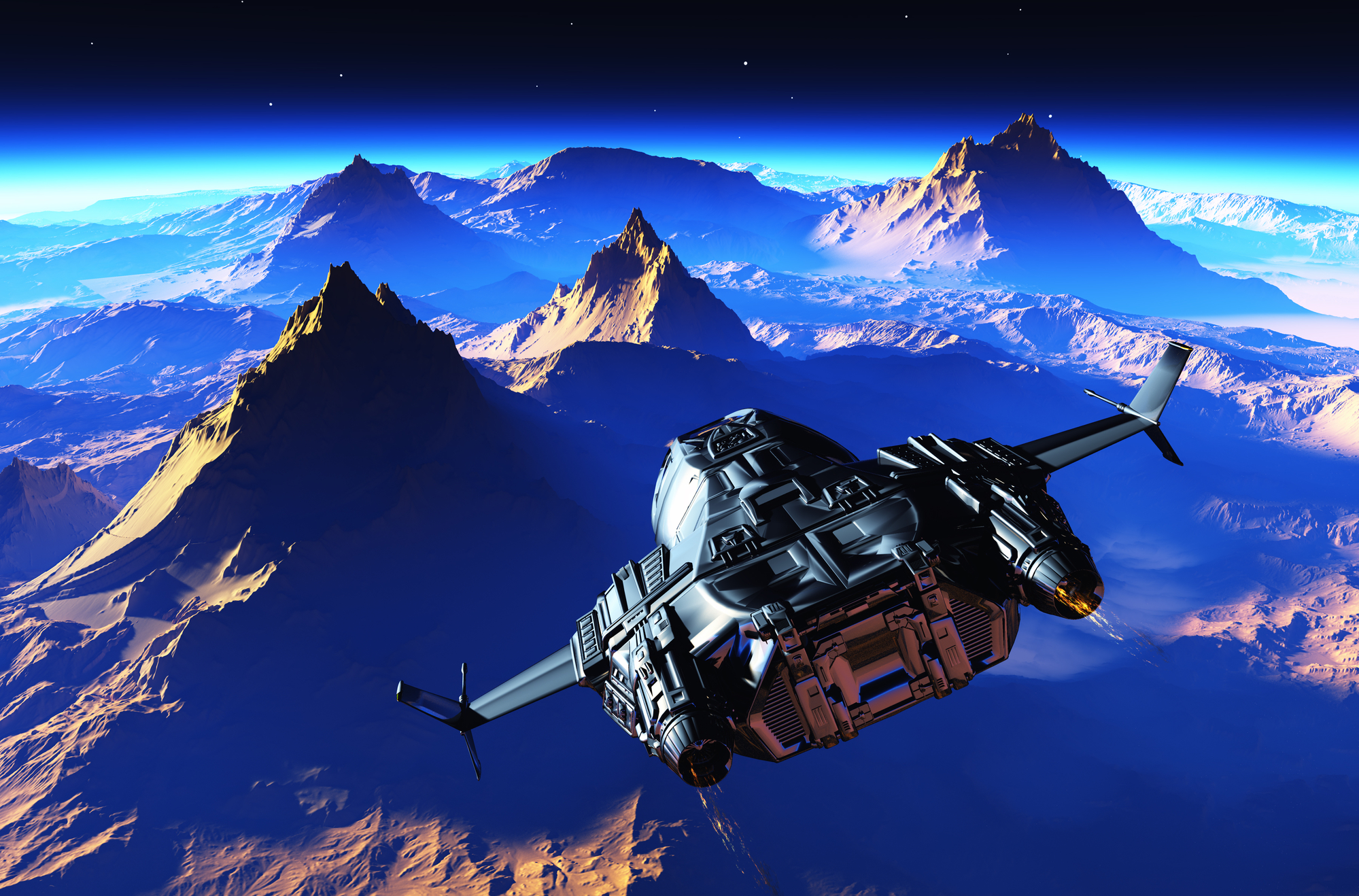 Spaceship on the background of the planet. 3d render