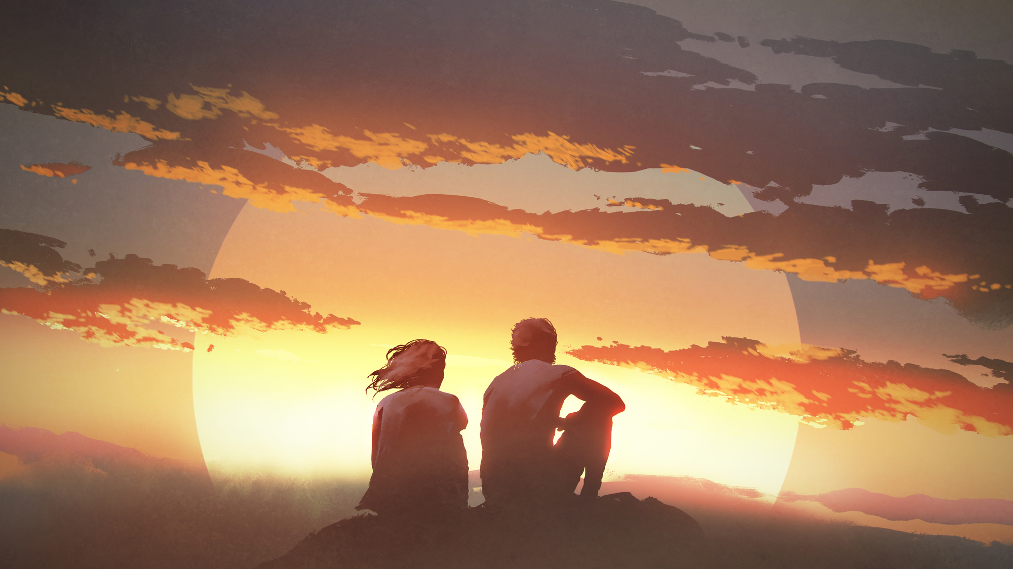 Depositphotos_197402304_L beth couple2 jan16 Previous silhouette of a young couple sitting on a rock looking at the sunset, digital art style, illustration painting